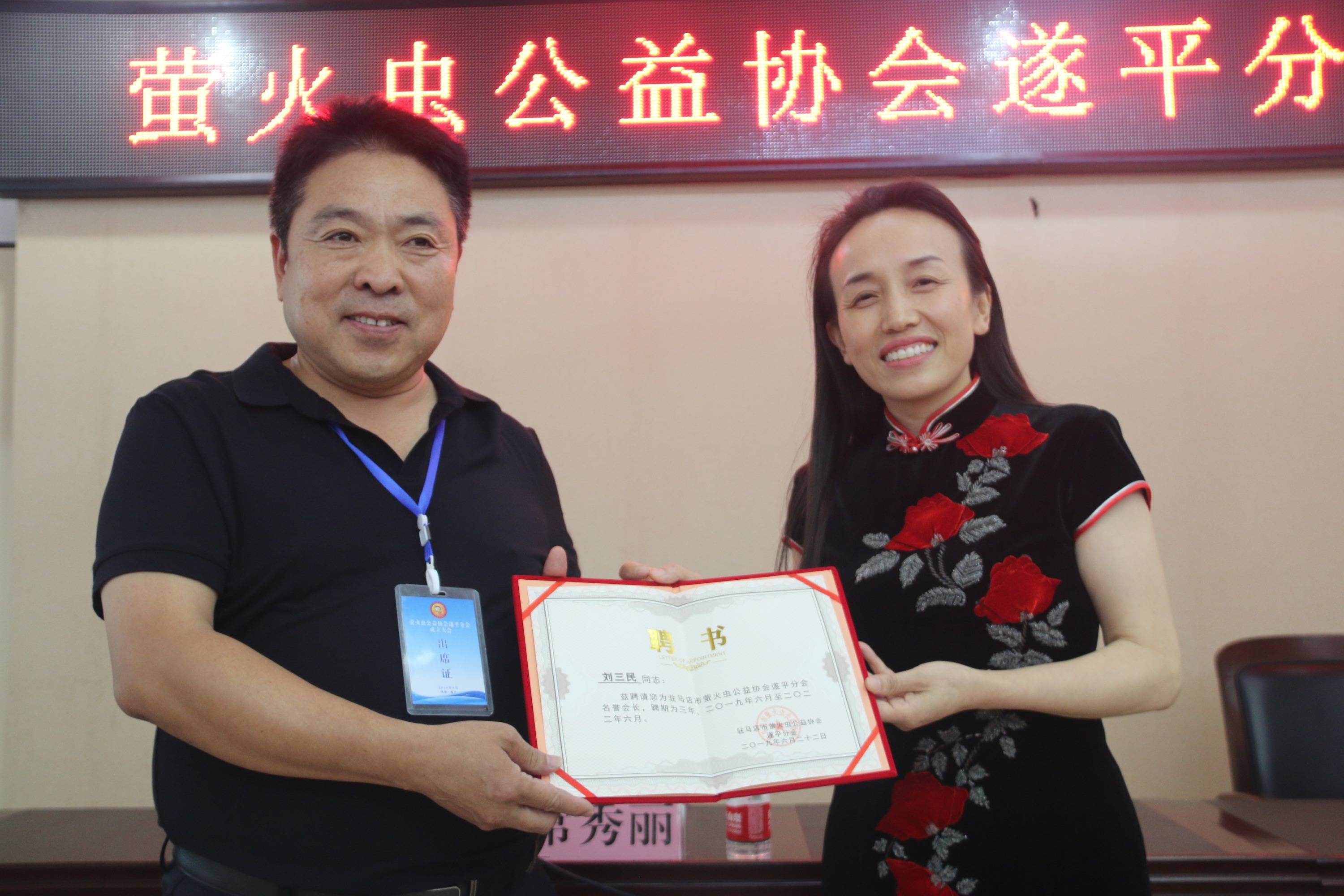 而后,新当选为驻马店市萤火虫公益协会遂平分会会长的张艳丽代表阳光艺术学校现场捐赠五万元公益基金用于帮扶特殊家庭的孩子,萤火虫公益协会顾问、二届政协副主席闫超代表协会为阳光艺术学校校长张艳丽授予“驻马店市萤火虫公益协会遂平分会会长单位”牌匾。驻马店市萤火虫公益协会总顾问闫超、原政协经济委员会主任崔强、驻马店市政协社会与法制委员会主任邢继伟、萤火虫公益协会常务副会长兼秘书长冯岳共同为遂平分会常务副会长河南农友王有限公司董事长王江涛、河南恒冠建筑有限公司董事长王春生、遂平分会秘书长王海峰、执行秘书长魏献忠,孙艳琴颁发牌匾。