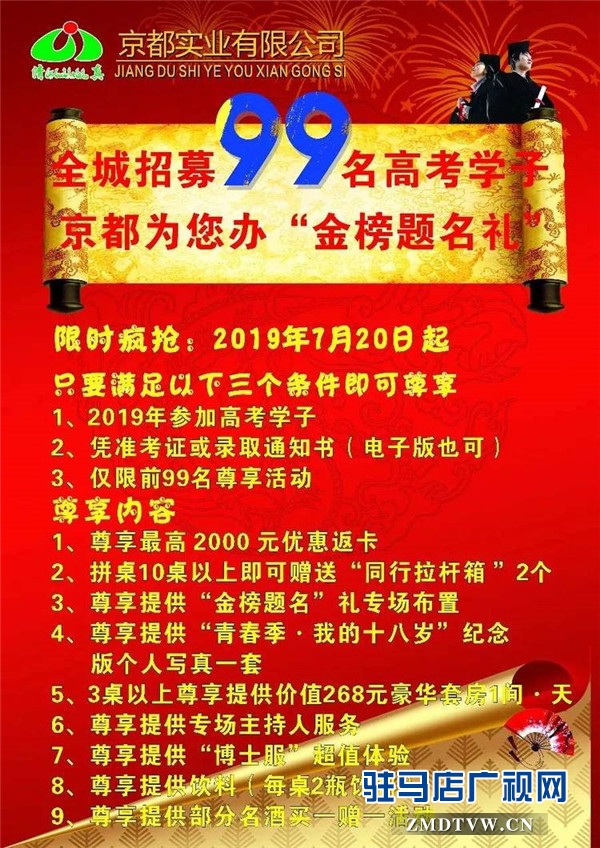 三尺讲台,三年同窗,最难忘却师恩重;数载师恩永难忘,一杯清酒表浓情。八斗旷世奇才,六月蟾宫折桂。十年寒窗苦读,一朝金榜题名。青春不散场,这个夏天,京都实业有限公司全城招募99名高考学子,活动自7月20日起,学生凭准考证或录取通知书(电子版也可以),即可享受京都提供的“金榜题名礼”。一齐开席,用心准备一场毕业盛宴!用一场满怀敬意的仪式,致敬青春和良师益友。