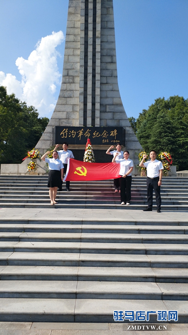 在竹沟革命纪念碑前,平舆支行全体党员紧握鲜红的党旗,高举右拳,重温入党誓词,再次向党作出庄严的承诺,以坚定的理想信念,坚守初心,滋养初心,践行初心。