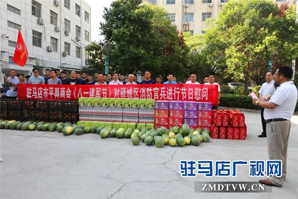 【驻马店融媒讯】(记者 朱剑锋 通讯员 张美玲 魏琳琳)八一慰问送清凉,鱼水情深意更浓。8月1日上午,为表达对消防应急队伍无私奉献的崇高敬意,发扬拥军爱民的光荣传统,增强与消防应急队伍之间的鱼水情,驻马店市平舆商会复转军人代表在平舆商会顾问、原平舆县县委副书记张德生,平舆商会顾问、原驻马店市商务局局长谭光郁,驻马店市平舆商会会长麻五军,驻马店市平舆商会常务副会长、秘书长徐杰等领导的带领下到驻马店市风光路南段的驿城区消防大队进行节日慰问,为消防应急救援队伍送去矿泉水、西瓜、桃子、留盆变蛋、秘制芥菜丝等基本生活物资,开创“军爱民、民拥军,军民鱼水情意深”的新局面,得到了社会各界的支持和赞扬。