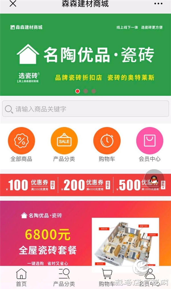 今日全新上线森森建材商城导航页面简洁、直观、便捷,首页分为全部商品、产品分类、购物车、会员四大板块,用户可以一目了然地进入相应版块,直观快捷地进行商品和品牌搜索,大大提高购物的精确度和效率,也切实地让消费者享受到了直营电商平台带来的优势。