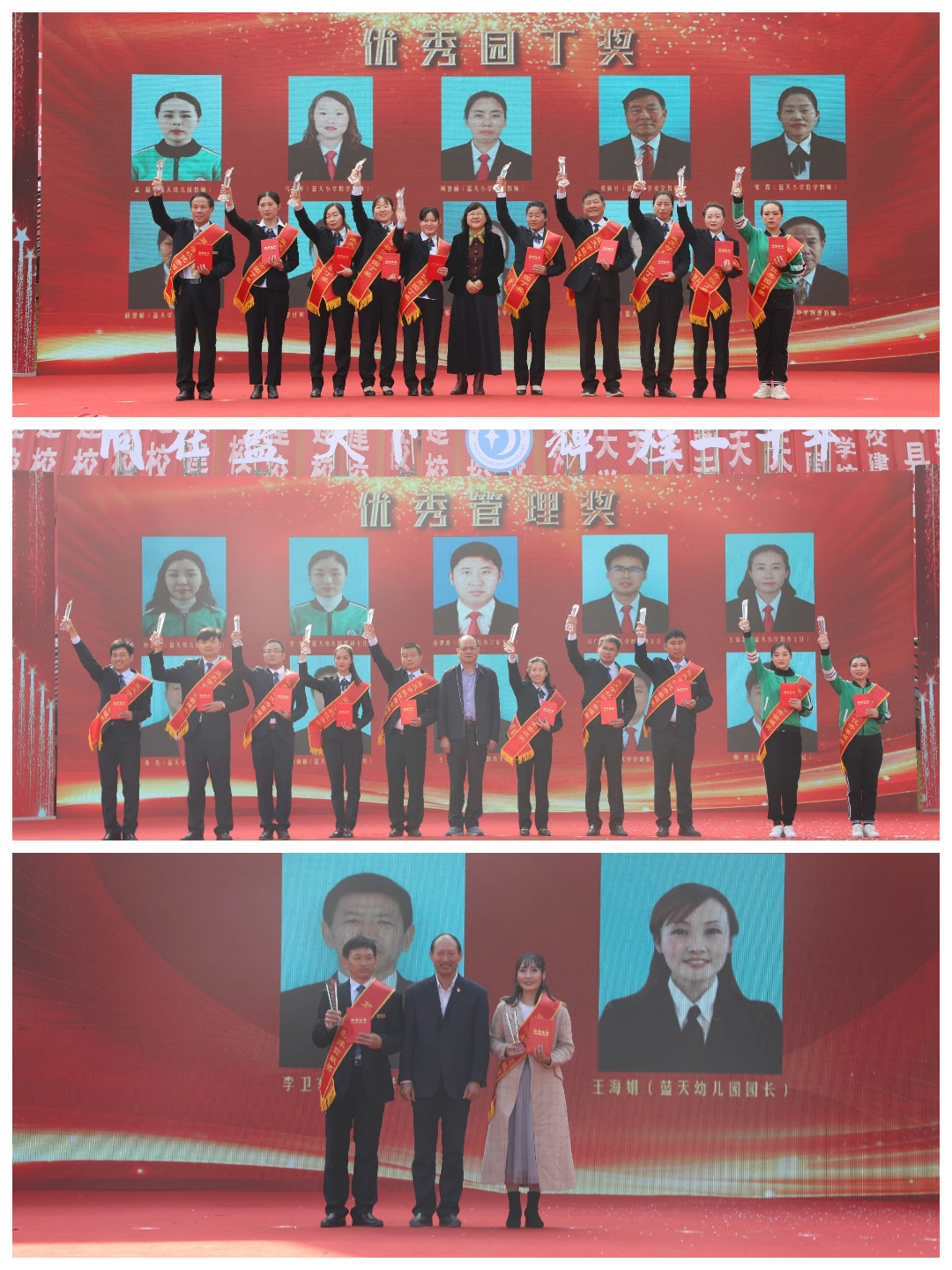 颁奖典礼上,孟阳、马海燕、周春丽、安新社、张霞、薛慧敏、黎付英、张娜、年敬、田心安等10名优秀教师获得“优秀园丁奖”;冉会敏、李娜、徐建波、冯广建、王钰涵、邓浩、胡颖颖、王力、胡海威、周勇等10名优秀教师获得“优秀管理奖”;蓝天学校校长李卫东、蓝天幼儿园园长王海娟喜获“特殊贡献奖”。他们教书育人,尽职尽责,每天用平凡琐碎的事情,见证并努力完善自己的教育人生,用实际行动诠释着一名人民教师的价值,他们以卓越的贡献挺起蓝天前进的脊梁,以不凡的事迹谱写出蓝天灿烂的辉煌。