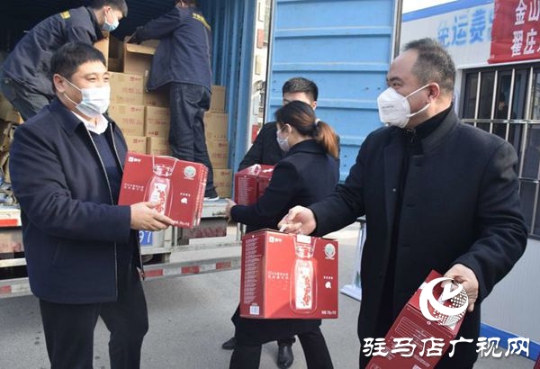 驻马店广电融媒体消息:1月29日下午,驻马店华通源供应链管理有限公司联合经济开发区慈善总会慰问经济开发区辖区内疫情管控卡点的值班人员。经济开发区党委书记、管委会主任史爱民,开发区党委副书记代林江,经济开发区慈善总会会长李如意,驻马店市华通源供应链管理有限公司董事长李华伟一行先后到洪河大道与学院路卡点、关王庙卫生院等卡点慰问,送去了价值92800元的牛奶、四角棚、遮阳伞等慰问物资,为值班人员送去关爱和温暖。