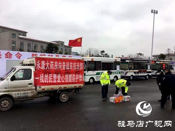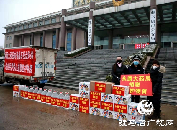 驻马店广电融媒体消息: (记者 朱剑锋 通讯员 王磊)2月6日下午,驻马店永康大药房总经理李慧敏一行带上抗击新型冠状病毒肺炎疫情防护用酒精、“84消毒液”及一次性橡胶手套等价值近万元的医用物品,先后前往市公安局及在京港澳高速开源大道出入口卡点,看望慰问战斗在抗击新型冠状病毒肺炎一线的公安执勤民警,用以疫情一线民警的自身防护。