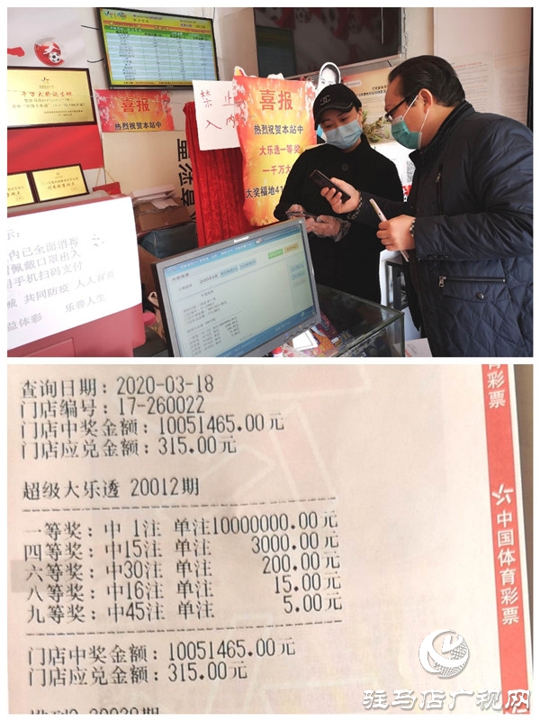 据驻马店体彩分中心泌阳县4117260022实体店的业主朱店长介绍,本次中奖购彩者采用的是复式投注方式。复式投注除了中1注一等奖10000000元,还中得15注四等奖,每注奖金3000元,以及八和九等奖若干,合计总奖金(税前)约10051150元。