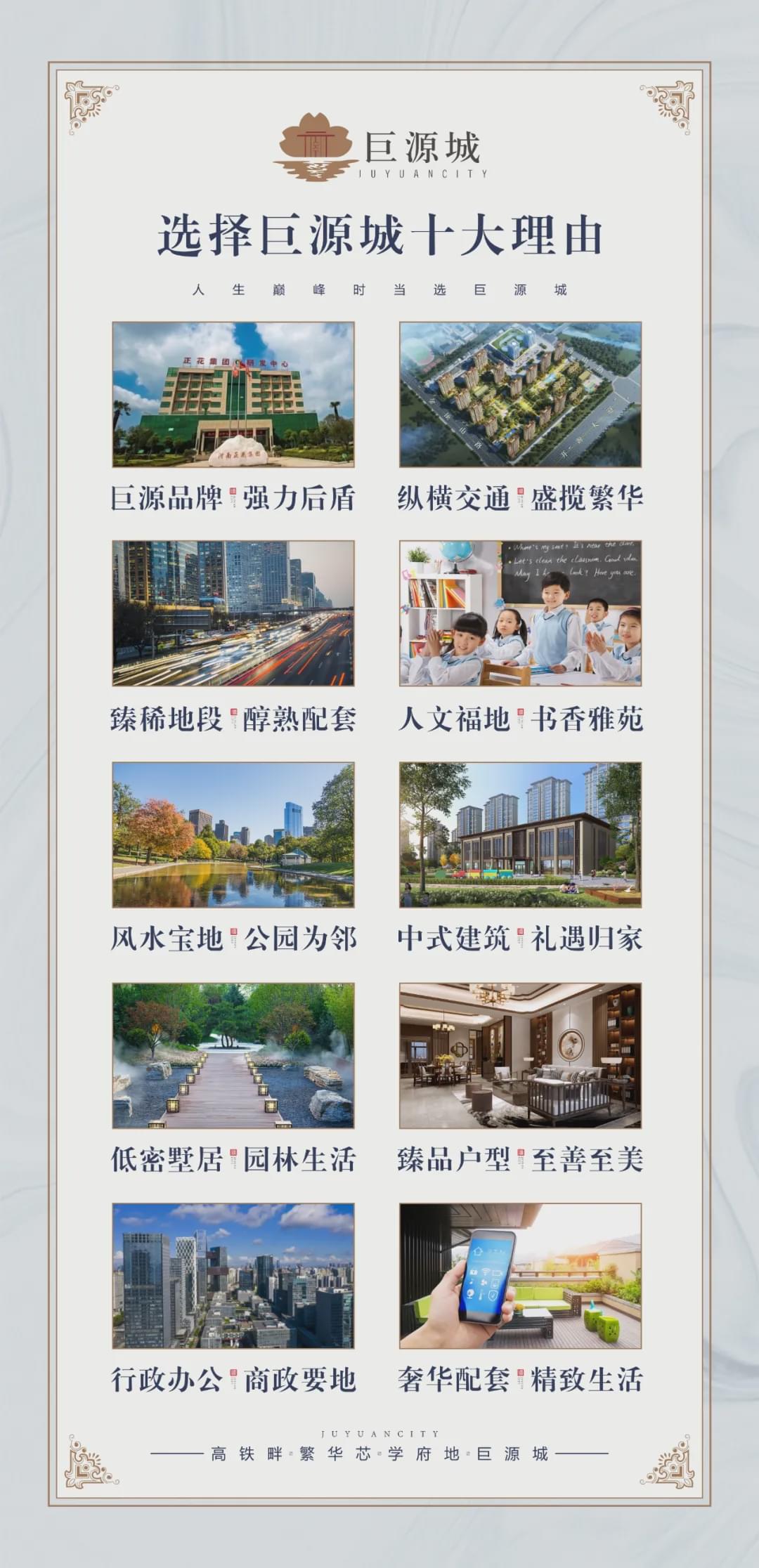 巨源城,作为正花置业第二子,踞高铁商务区核芯,二大公园环绕,自带约13万方高品质城市引领型商业综合体,紧邻高铁西站、汽车客运枢纽站,约2小时通达全国,项目自建国际双语幼儿园,“零”距离专享驻马店实验中小学,周边2公里内东方剑桥幼儿园,天中实验小学,三十三小学,市实验中学,新地高,黄淮学院等密集分布,一站式成熟配套,以品牌之优、地段之好、教育之精、配套之全、人居之舒,将5大理想生活维度层层铺展,匠心造城,为天中美好生活持续赋能。