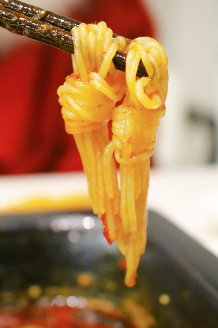 红彤彤的魔芋粉丝结让人无法抗拒,大嘴一口一个~