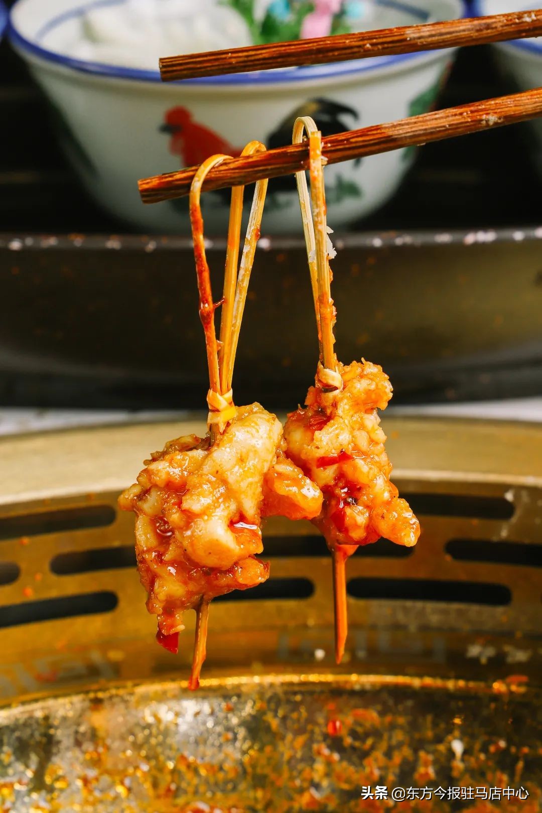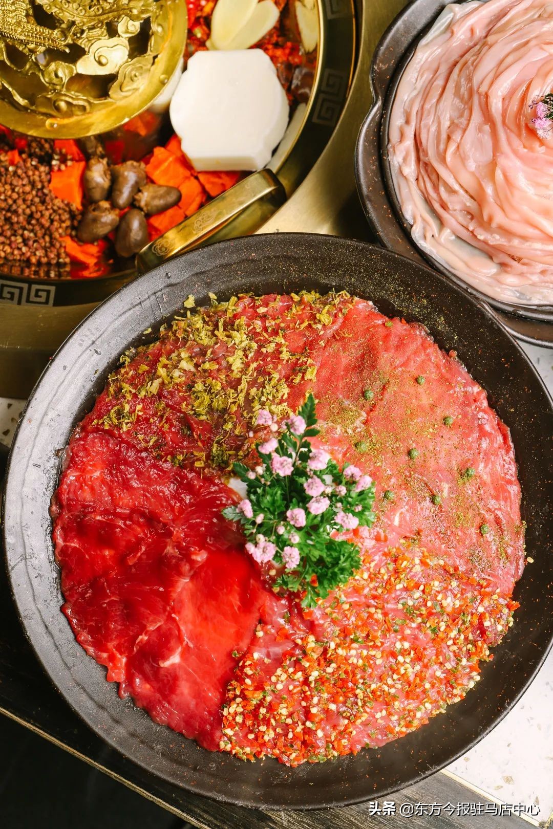 牛肉裹着满满配料放入沸腾的锅底,带着独特口味与红汤相遇,入口鲜嫩弹牙。