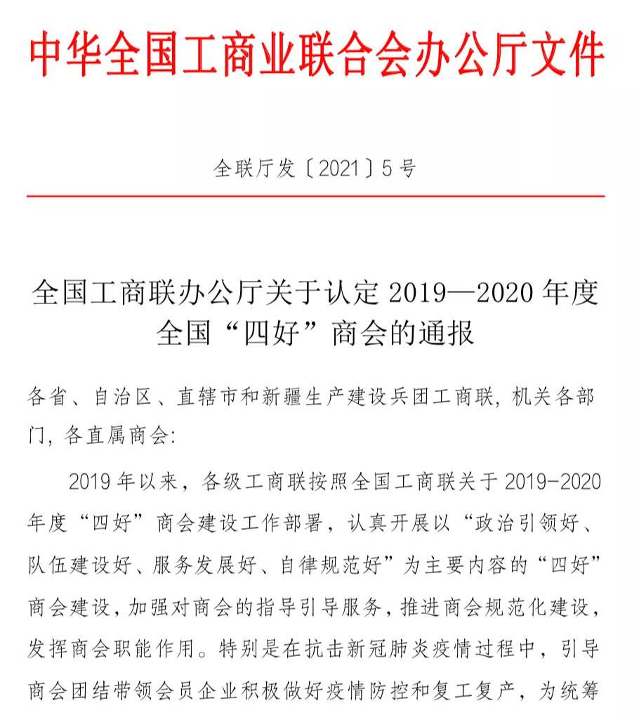 1月24日,全国工商联发布了《全国工商联办公厅关于认定2019-2020年度全国“四好”商会的通报》,通报表示,按照《全国工商联办公厅关于开展2019-2020年度全国“四好”商会认定工作的通知》要求,对照全国“四好”商会建设标准,在各地工商联逐级推荐、省级工商联审核把关、全国工商联组织专家评审的基础上,经全国工商联主席办公会议审议通过,认定1478家商会为2019-2020年度全国“四好”商会。在此次表彰中,驻马店市上蔡商会榜上有名,荣膺全国“四好”商会。