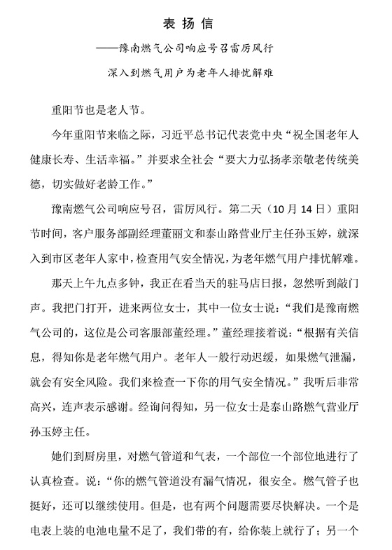 10月16日上午,豫南燃气办公室收到一封来自市文化广播旅游局退休老干部宋先生的表扬信,信中特别提到豫南燃气在重阳节到来之际,响应习近平总书记关于“弘扬孝亲敬老传统美德,切实做好老龄工作”的号召,雷厉风行,深入到燃气用户为老年人排忧解难,是一个信得过、靠得住的公司,豫南燃气的用户服务精神更是难能可贵。