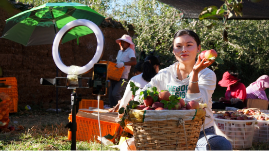 △拼多多主播在产地直播,向消费者介绍盐源苹果特点。