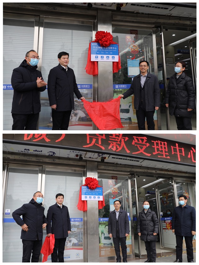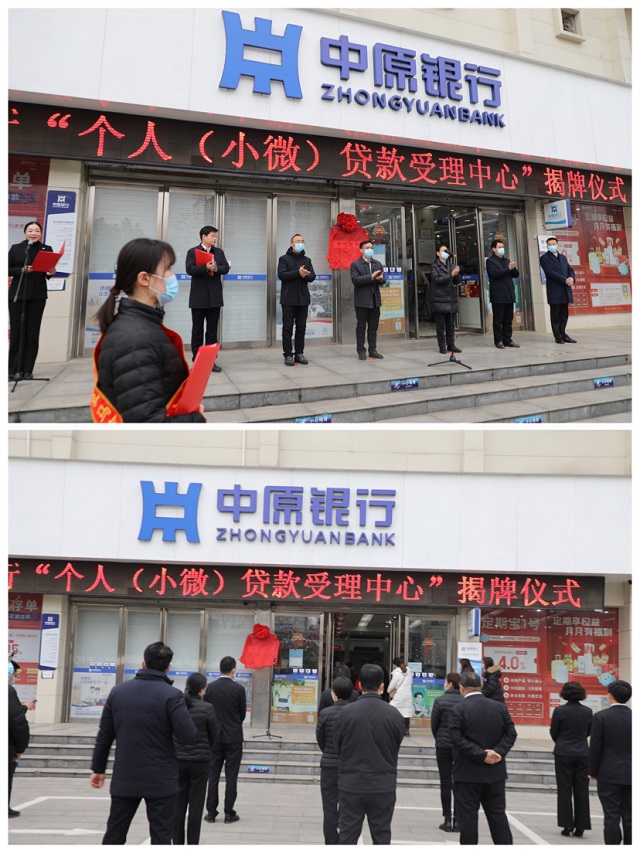 驻马店市政府副市长张威、中原银行驻马店分行负责人崔正阳共同为中原银行驻马店分行个人(小微)贷款受理中心揭牌。