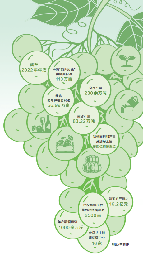 民权县加大对酿酒葡萄种植技术的研发力度,引导农户调整种植结构,发展冷棚、暖棚等设施种植酿酒葡萄。全县共注册葡萄酒企业16家,葡萄酒产值达16.2亿元。