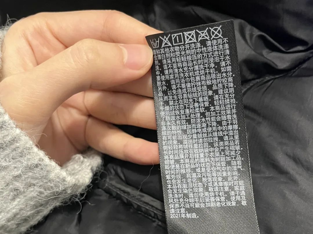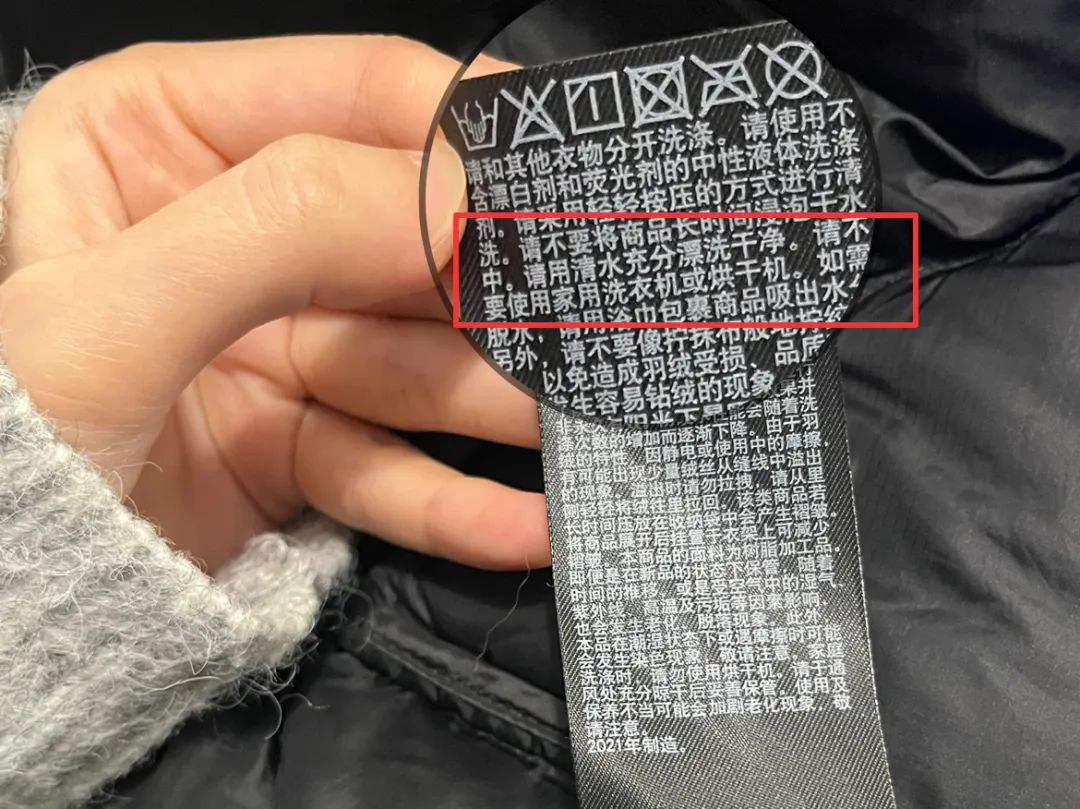看,我随机抽查了一件羽绒服,它就是典型的“不可干洗,可水洗”。