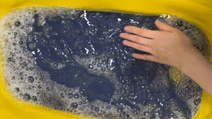 第三步:在水盆/水池中倒入10g 洗衣液,和不高于 40°C 的水充分搅拌溶解,将羽绒服平铺浸透,反复按压漂洗。注意,不要揉搓。