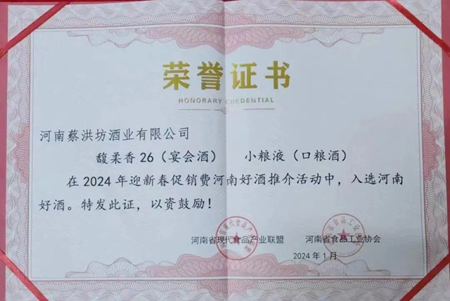 1月18日,由河南省工业和信息化厅、河南省豫酒振兴领导小组办公室指导,河南省现代食品产业联盟、河南省食品工业协会主办的2024年迎新春·促消费河南美食榜暨河南好酒发布推介活动在郑州市举行。在活动颁奖环节,蔡洪坊酒业被河南省食品工业协会授予“纯粮固态发酵白酒酿造示范企业”荣誉称号,蔡洪坊馥柔26、小粮液双双入选河南好酒榜单。