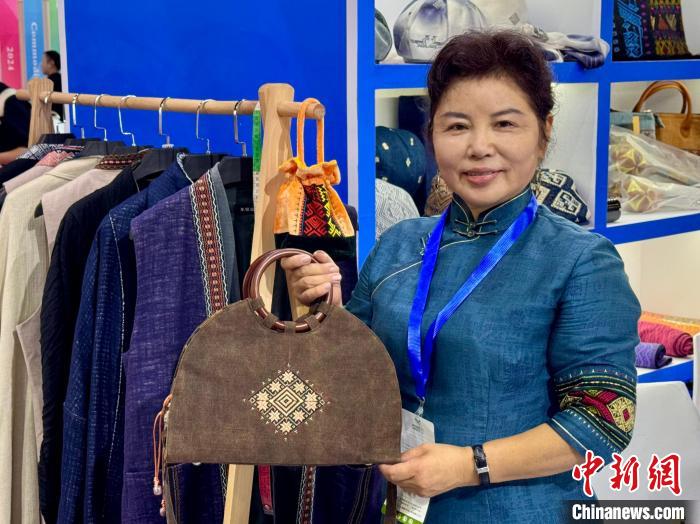 10月13日,来自海南的琴韵幽兰品牌设计师王彬妮展示黎锦元素面料制成的产品。董易鑫 摄