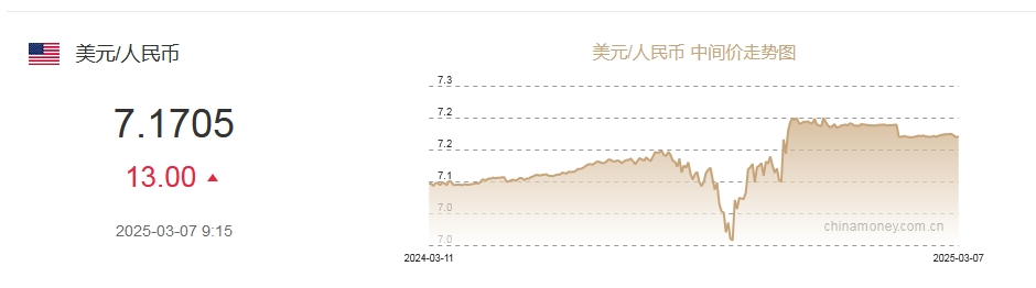 中新网3月7日电 据中国外汇交易中心网站消息,中国人民银行授权中国外汇交易中心公布,2025年3月7日银行间外汇市场人民币汇率中间价为:1美元对人民币7.1705元,下调13个基点。
