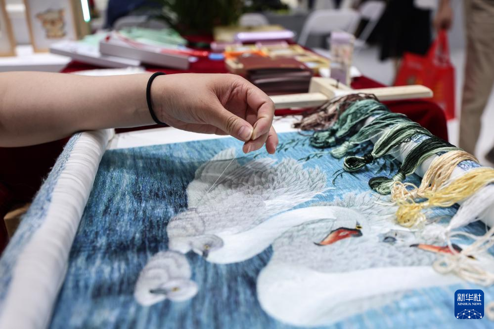 4月15日,参展商在消博会上制作湘绣。湘绣是国家级非物质文化遗产。