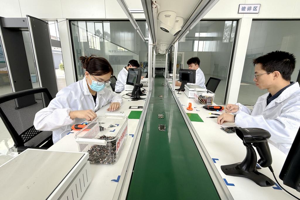 中国资环集团手机安全回收处置项目负责人廖欢乐介绍,集团与中国邮政速递物流深度合作,打通了安全回收流转路径,手机的回收、流转、拆解和破碎等全程可视化、可监控、可溯源。