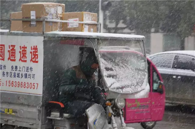 辛勤工作的快递哥也是冒着大雪早早出门,开始一天的快递配送工作,而这一切,除了养家糊口,你也不得不承认是为了让你更早的收到自己的包裹。