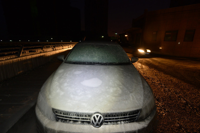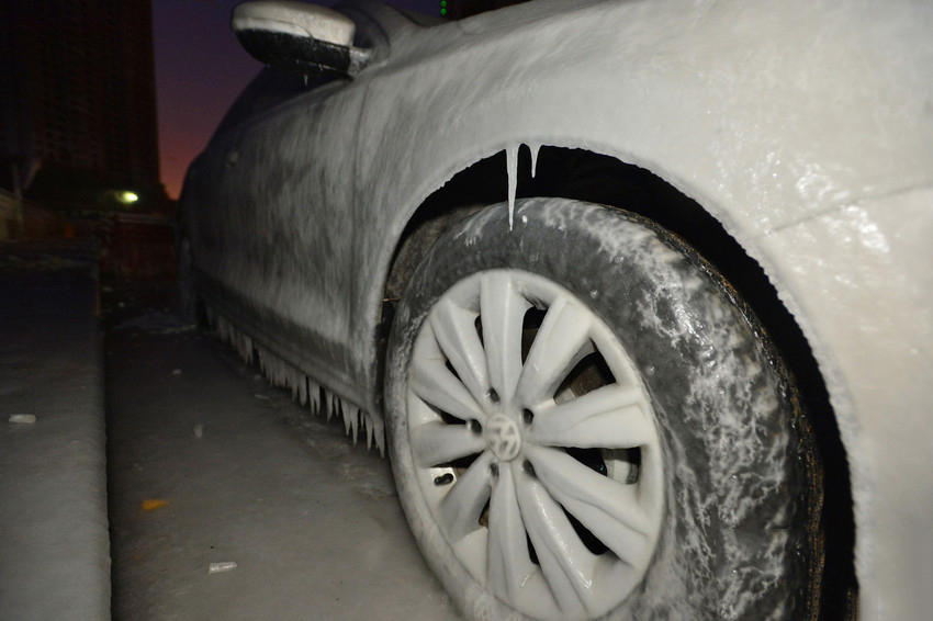 2016年1月24日,青岛遭遇霸王寒潮,市区最低气温一度达到-15摄氏度,破1961年青岛有气象记录以来最低。位于市南区金茂湾小区,海浪拍打上临近海边的步栈道,停在此处的轿车被海水冻住。
