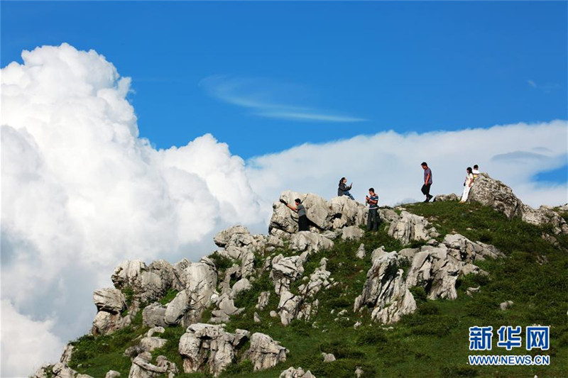 7月15日,人们在甘肃张掖扁都口油菜花田间游览。 炎炎夏日,人们纷纷来到户外,亲近自然,休闲消夏。 新华社发(成学磊 摄)