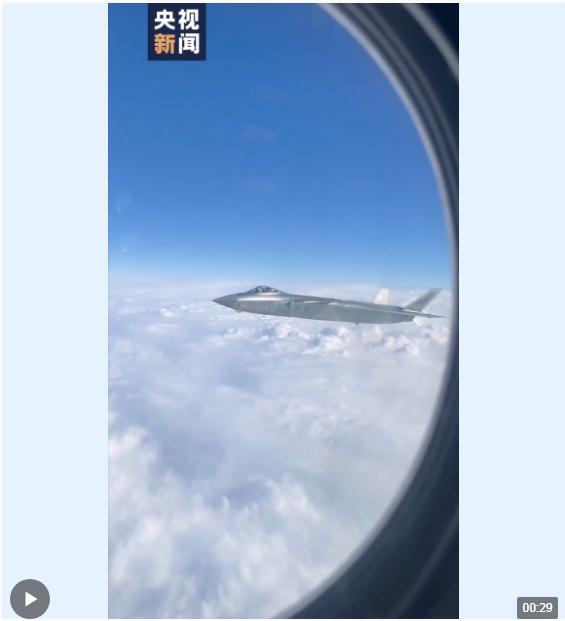 △两架歼-20战机在我国领空为执行接运任务的运-20伴飞护航,以“双20”列阵长空告慰英烈,表达崇高敬意,抒发追思之情。