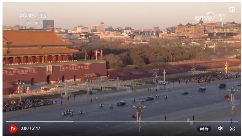 米尔济约耶夫在习近平陪同下检阅中国人民解放军仪仗队。
