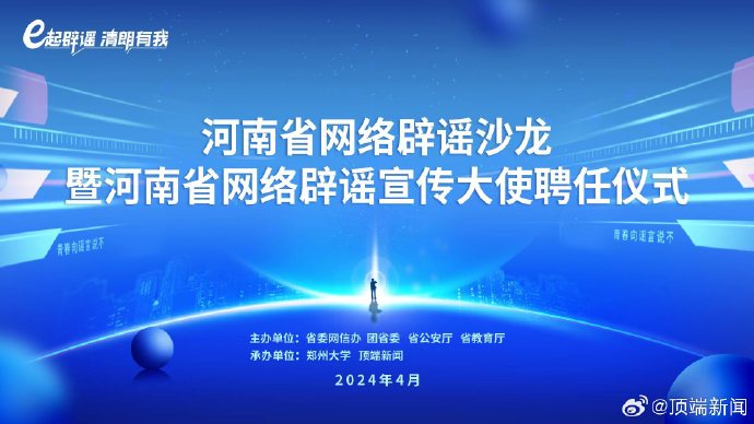 【#河南青年向谣言说不# !#河南网络辟谣沙龙#来了】“e起辟谣,清朗有我”。2024年河南网络辟谣沙龙暨河南省网络辟谣宣传大使聘任仪式将于4月3日在@郑州大学 举行。届时,网信、公安、新闻媒体等代表和网络大V、专家学者等230多人汇聚一堂,共话网络辟谣,营造清朗网络空间。