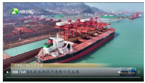 江苏连云港台记者 王强:我现在是在江苏连云港新苏港码头,钢铁生产的第二步就是从这里开始。在我身后,30多万吨来自巴西的铁矿石正在卸船,它们是钢铁冶炼的重要原材料,接下来它们将从长江、淮河、沙颍河一路而上,大约10天后到达河南周口沈丘港。