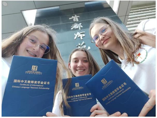 匈牙利学生王米丽(左)、胡灵月(中)、宋智孝(右)手持国际中文教师奖学金证书在首都师范大学合影。(受访者供图)