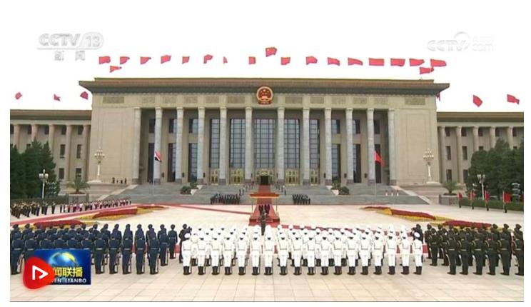 塞西抵达时,礼兵列队致敬。两国元首登上检阅台,军乐团奏中埃两国国歌,天安门广场鸣放21响礼炮。塞西在习近平陪同下检阅中国人民解放军仪仗队,并观看分列式。