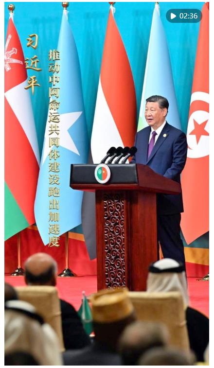 习近平主席在主旨讲话中指出,中方愿同阿方构建“五大合作格局”,推动中阿命运共同体建设跑出加速度。