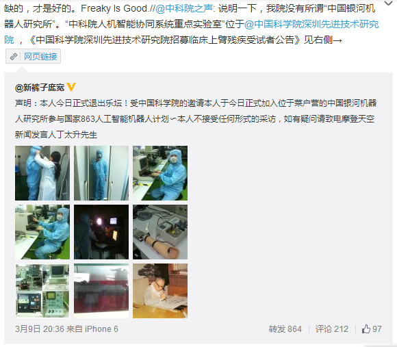 庞宽有次还发微博称自己正式加入中科院的中国银河机器人研究所,还被微博@中科院之声转发“打脸”。采访中庞宽回应:“我是有一个朋友,他确实是一个科学家。 他叫陈涌海,跟窦唯也合作。然后他是中科院半导体自动化研究所博士生导师,我就去他实验室取了个景。”