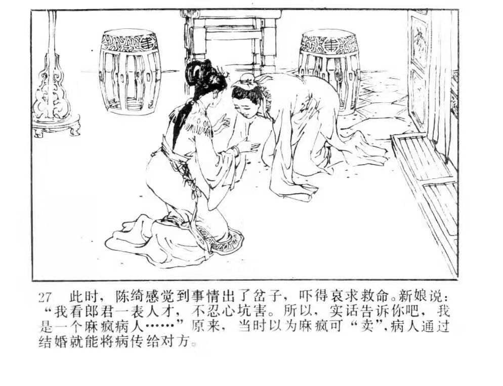 以岭南地区“过癞”习俗改编的爱情故事《邱丽玉传》连环画插图。蓝本来自于宣鼎《夜雨秋灯录》中《麻疯女邱丽玉》小说故事。