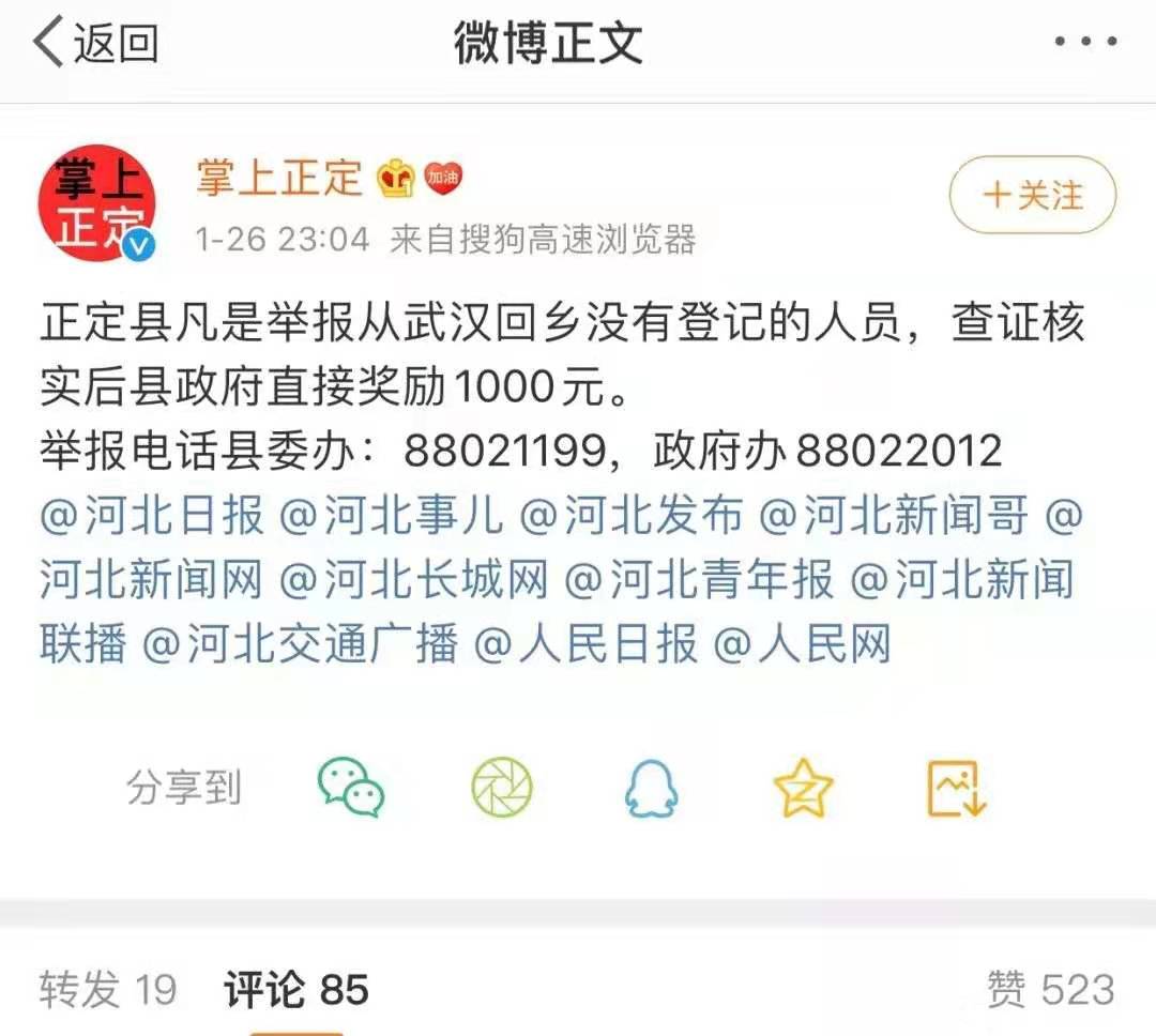 河北正定县发布对武汉返乡没有登记的人员的悬赏举报。