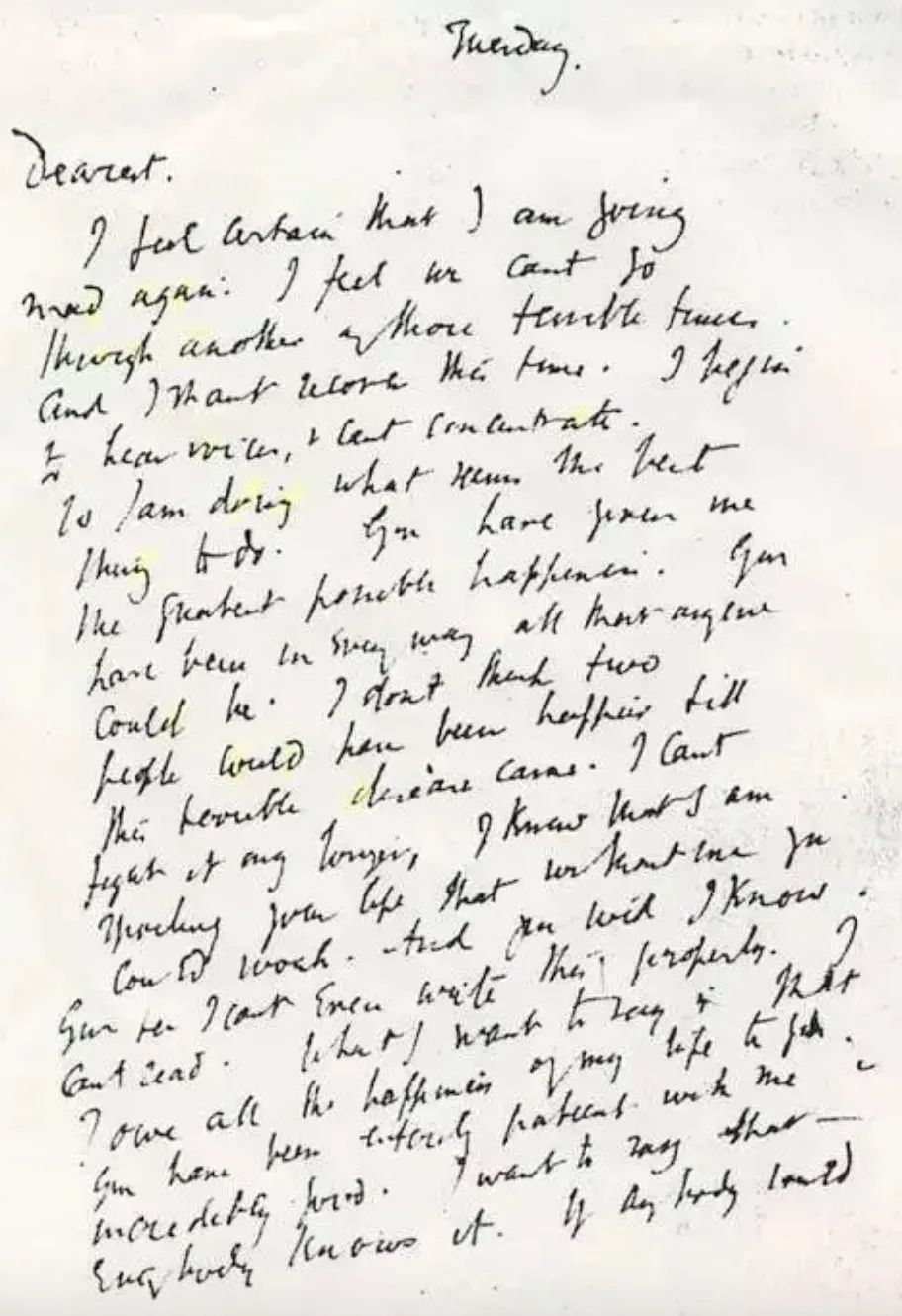 然而躁狂症带给伍尔夫的不总是五彩的焰火,它还不断地把她带入了情绪的低谷。在最终步入河水、结束生命之前,她给丈夫留下了这样一封遗书:
