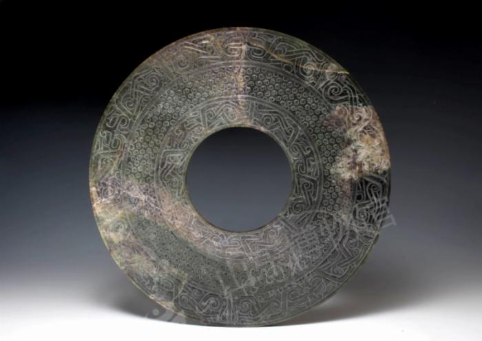 玉料呈青碧色,玉质晶莹温润,半透明,油脂光泽,为战国玉璧中的精品,也是战国玉璧中形制最大的一件。
