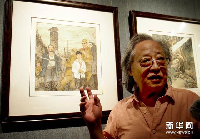 9月3日,连环画家杨宏富(前)在他的作品前为观众导赏。新华社记者 任珑 摄