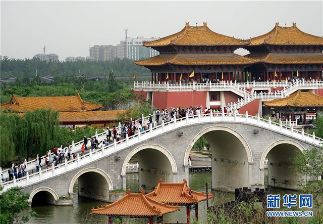 游客在开封的清明上河园景区内游览(2016年5月2日摄)。新华社记者 李安 摄