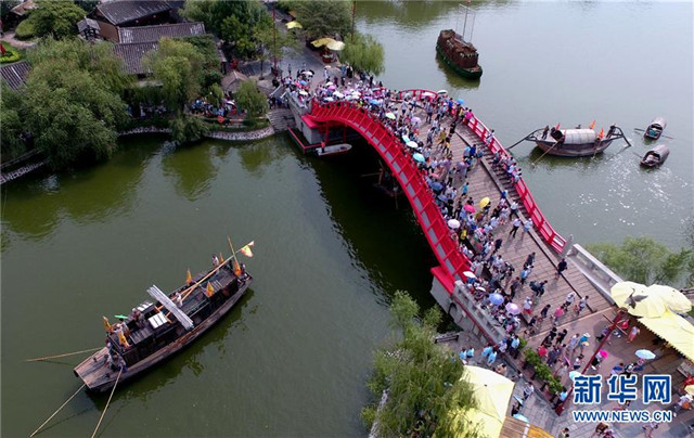 游客在开封的清明上河园景区内游览(2016年7月31日摄)。新华社记者 李安 摄