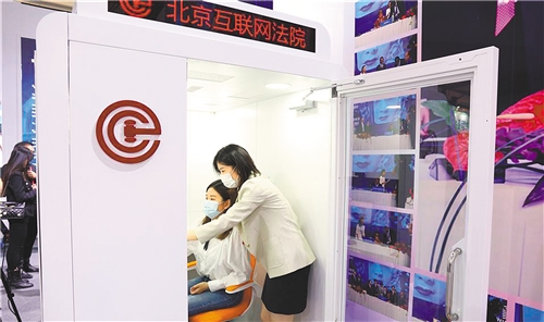 图为北京互联网法院亮相2020年中国国际服务贸易交易会,重点展示“版权链—天平链”协同治理平台等工作成果。