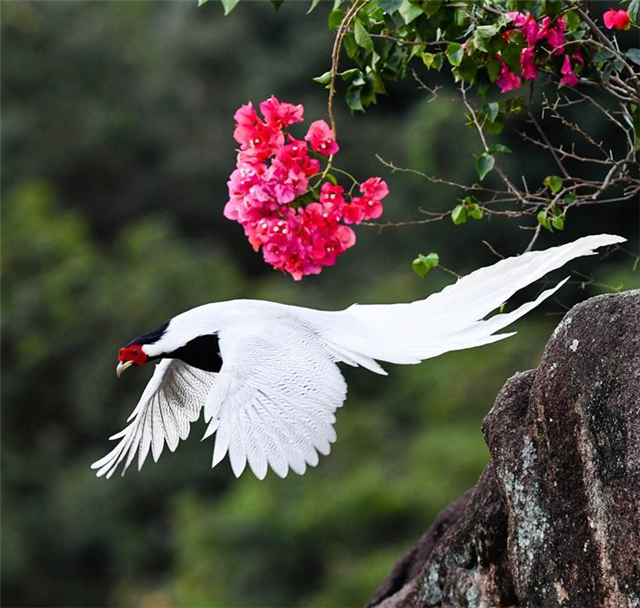10月14日,在南靖县鹅仙洞国家级自然保护区,一只白鹇从岩石上飞跃而起。 金秋时节,福建省南靖县鹅仙洞国家级自然保护区风景如画,数量逐年增多的野生白鹇漫步其间,成为当地新的自然景观。 新华社记者 彭张青 摄