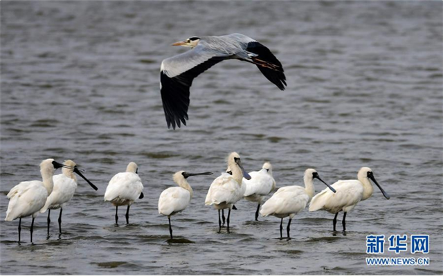11月8日,在闽江河口国家湿地公园,全球濒危珍稀鸟类之一、国家二级保护动物黑脸琵鹭(下)在滩涂上歇息觅食。 闽江河口国家湿地公园位于福建省福州市长乐东北部闽江入海口,以河口浅滩为主,为闽江流域多年沉积形成的大片潮间沙滩和泥滩。这里是候鸟迁徙重要越冬地、水鸟集中分布区和众多珍稀濒危鸟种的栖息地,公园内动植物种类繁多,每年有数以万计的候鸟来此栖息越冬。 新华社记者 魏培全 摄