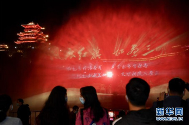 11月23日晚,市民和游客在福建沙县沙溪河畔欣赏水幕灯光秀。