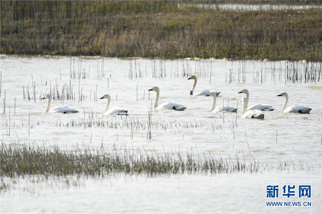 近日,成群的天鹅在迁徙途中飞临南京境内的石臼湖休息、觅食。有着“天空之境”美称的石臼湖变身“天鹅湖”,成为一道美丽的风景。新华社记者 季春鹏 摄