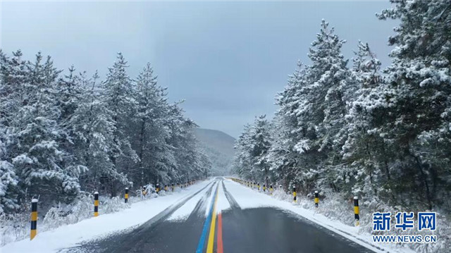 太岳1号公路两旁的翠柏披上了厚厚的银装。新华网 发 (程广 摄)