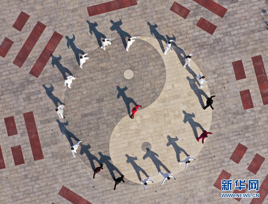 太极拳爱好者在河北省邯郸市永年区太极小镇习练太极拳(无人机照片,12月16日摄)。新华社发