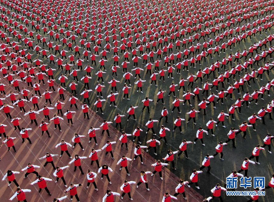 河南省焦作市温县第一高级中学的学生在操场上练拳(无人机照片,12月15日摄)。新华社记者 李安 摄